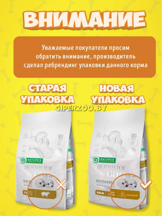 Сухой корм Nature’s Protection Superior Care White Dogs - полнорационное питание для взрослых собак средних, мелких и карликовых пород белого окраса в возрасте старше одного года (масса тела взрослой собаки 1-10 кг), с особыми потребностями в уходе за кожей и белой шерстью.
