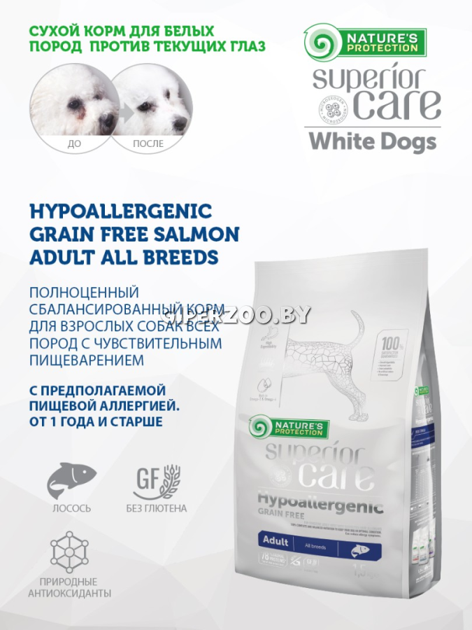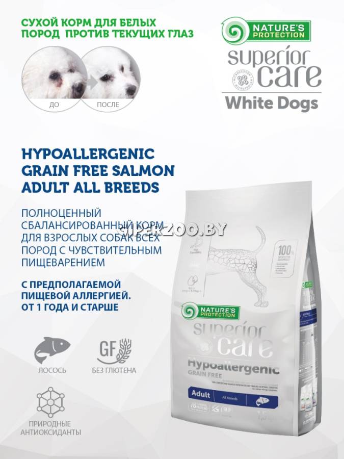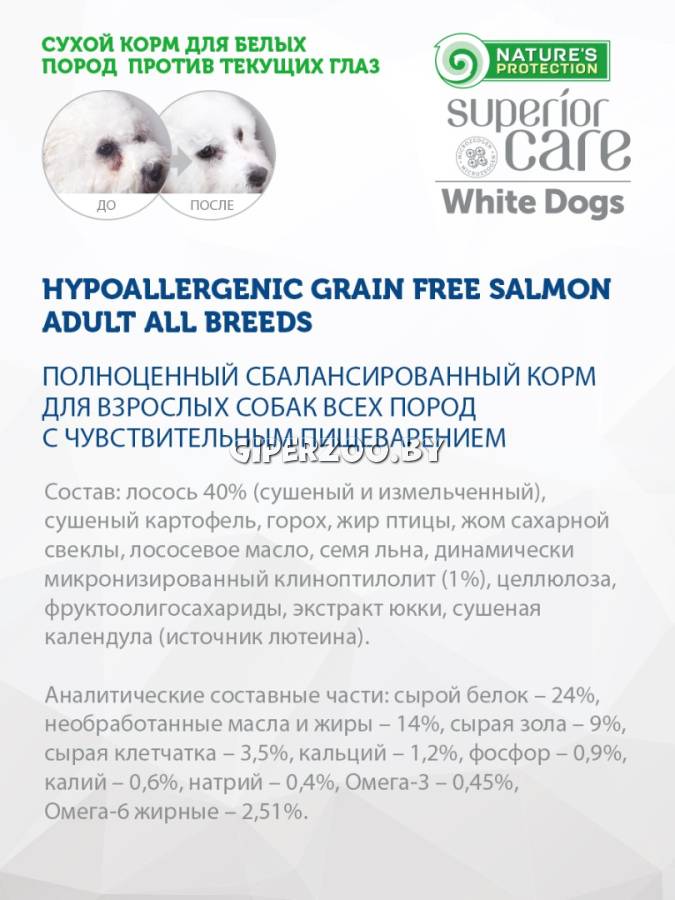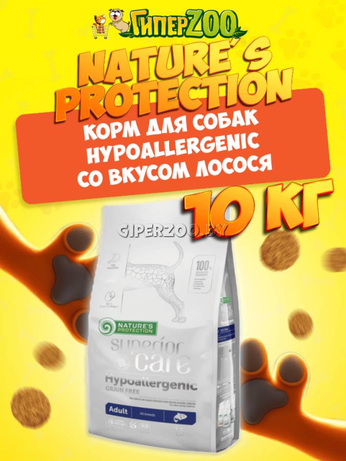 Nature's Protection Superior Care Grain Free Hypoallergenic Salmon (Лосось), 10 кг – это сбалансированный беззерновой рацион, в основе которого лежит лосось и овощи.