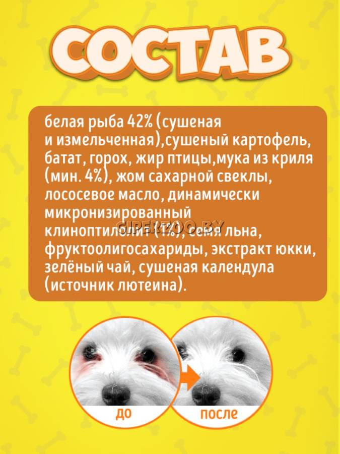 Благодаря тщательно подобранному источнику белков поддерживается правильный состав слезной жидкости, что может помочь устранить коричневые слезные пятна вокруг глаз, морды и на лапах.