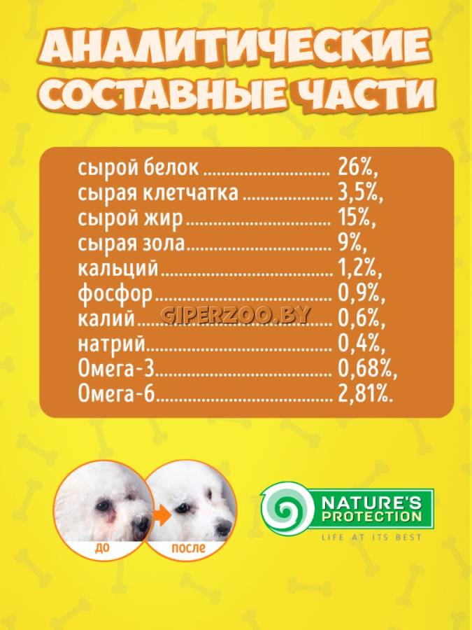 Аналитический состав: сырой белок – 26%, сырая клетчатка – 3,5%, сырой жир – 15%, сырая зола – 9%, кальций – 1,2%, фосфор – 0,9%, калий – 0,6%, натрий – 0,4%, Омега-3 жирные кислоты – 0,68%, Омега-6 жирные кислоты – 2,81%.