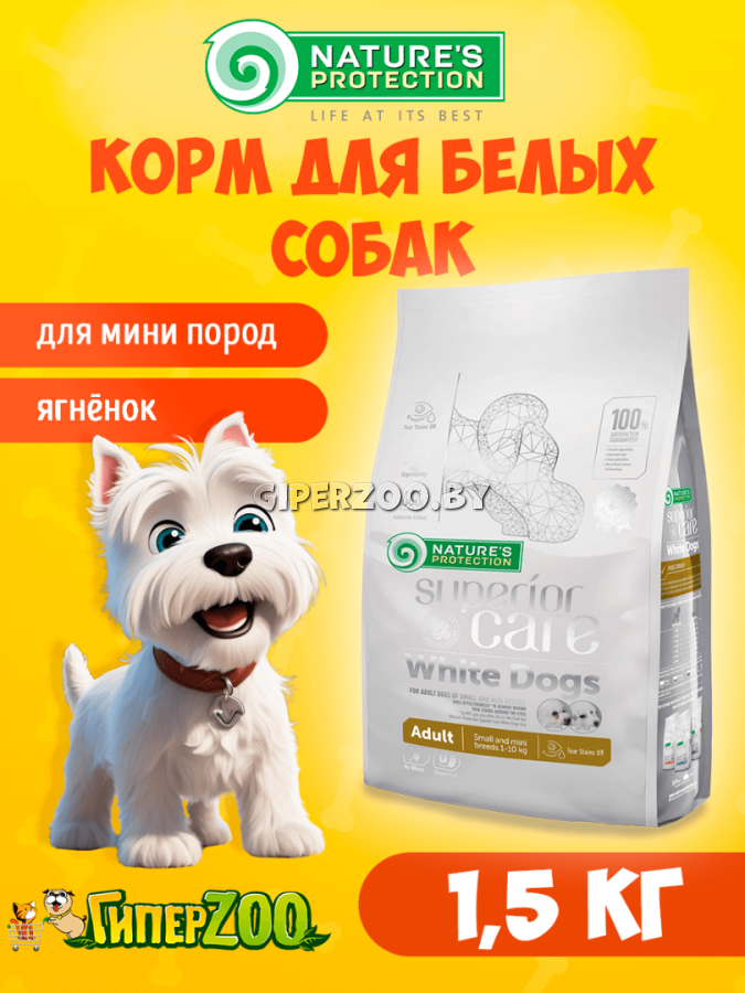 Nature's Protection SC White Small Dog Adult (ягнёнок), 1,5 кг + лакомство - полнорационный корма для взрослых собак мелких и карликовых пород с белой шерстью. Для собак старше 1 года, масса тела взрослой собаки от 1-10 кг.