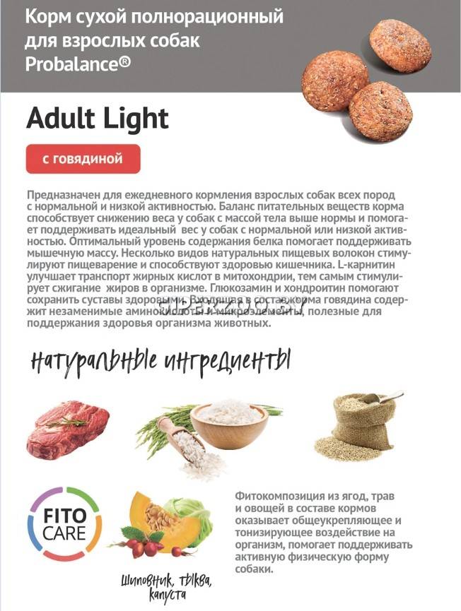 Корм рекомендован для ежедневного кормления взрослых и пожилых собак всех пород. Корм Probalance Adult Light помогает снизить лишний вес у собак с массой тела выше нормы и поддерживать идеальный вес у питомцев с нормальной или низкой активностью.