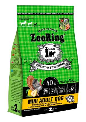 ZooRing Mini Adult Dog (Индейка и рис с грушей) — полнорационный сухой корм с глюкозамином и хондроитином для взрослых собак мини пород.