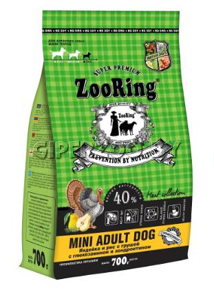 ZooRing Mini Adult Dog (Индейка и рис с грушей) — полнорационный сухой корм с глюкозамином и хондроитином для взрослых собак мини пород.