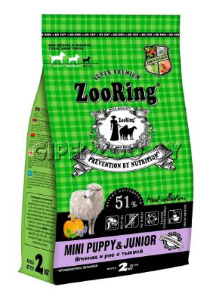 ZooRing Mini Puppy&Junior (Ягненок и рис с тыквой) — полнорационный сухой корм для щенков и юниоров, а также беременных и кормящих собак мини пород.