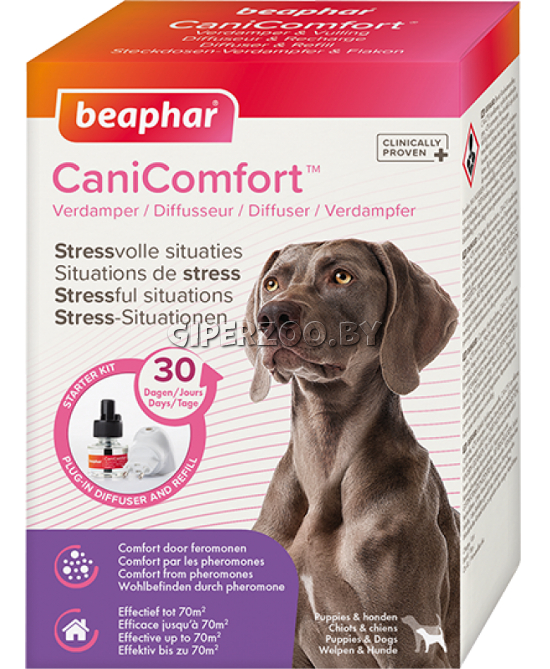 Beaphar CaniComfort полезен, когда собаки сталкиваются с новым опытом, таким как дрессировка, незнакомая обстановка, новый дом, новый член семьи или другие стрессовые ситуации, такие как грозы, фейерверки и громкие звуки. Феромон собачьего умиротворения (DAP) естественным образом вырабатывается кормящей сукой и помогает щенкам ориентироваться и отличать безопасные области окружающей среды. В Beaphar CaniComfort используется синтетический аналог феромона собачьего умиротворения, что дает собакам чувство безопасности.
