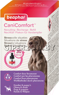 Beaphar CaniComfort™ полезен, когда собаки сталкиваются с новым опытом, таким как дрессировка, незнакомая обстановка, новый дом, новый член семьи или другие стрессовые ситуации, такие как грозы, фейерверки и громкие звуки. Феромон собачьего умиротворения (DAP) естественным образом вырабатывается кормящей сукой и помогает щенкам ориентироваться и отличать безопасные области окружающей среды. В Beaphar CaniComfort™ используется синтетический аналог феромона собачьего умиротворения, что дает собакам чувство безопасности.