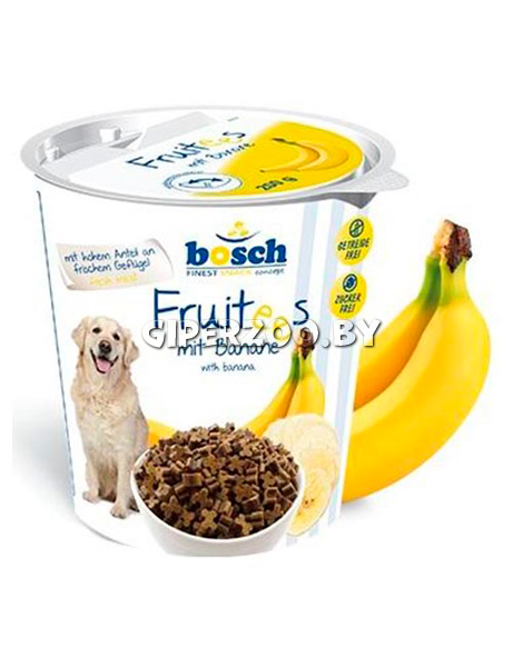 Лакомство Бош Фруттис с бананом, 200 гр - лакомство произведёно на основе свежего мяса домашней птицы, картофеля, банана и великолепно подходит как дополнительное питание собак или в качестве поощрения.
