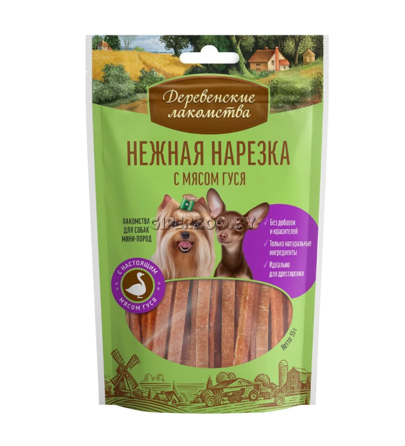 Деревенские лакомства нарезка из гуся, 55 гр - мясной деликатес изготовлен специально для собак мини-пород. Идеального размера кусочки отборного мяса готовятся без добавления красителей и консервантов. Нежнейшее мясо птицы — что может быть лучше для улучшения аппетита вашего маленького охотника.