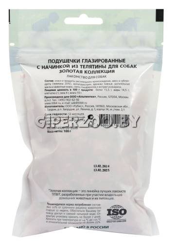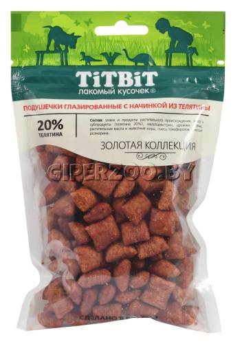 ТИТБИТ Подушечки глазированные (телятина), 100 гр - это аппетитные лакомства, которые, благодаря нежной мясной начинке и уникальному верхнему слою, имеют привлекательный внешний вид и невероятный вкус. Хрустящие подушечки в мясной обливке, напоминающей кондитерскую глазурь для людей. Как и глазурь, обливка придает особый вкус продукту, который понравится даже самому привередливому питомцу. Она абсолютно безопасна и не содержит сахара. Телятина, входящая в основу начинки, обогащает организм высококачественным животным белком, минералами, витаминами и аминокислотами.