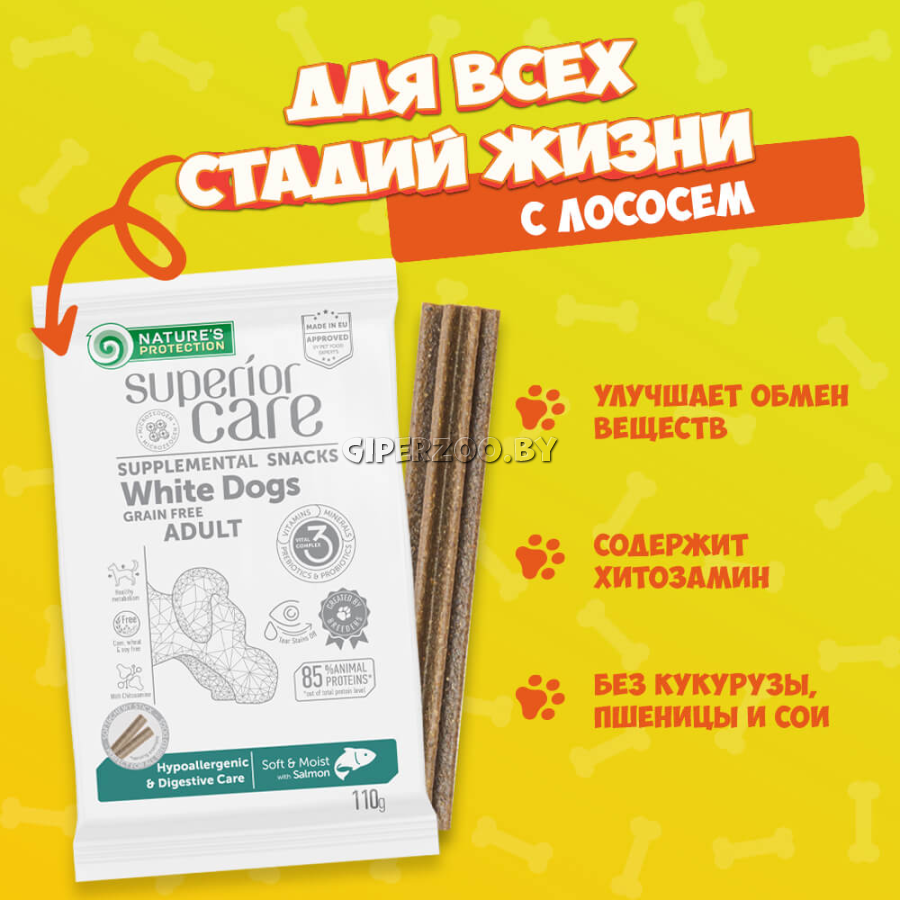 Беззерновые лакомства Natures Protection Superior Care White Dogs Grain Free Hypoallergenic Digestive Care – это высококачественная добавка к корму, предназначенная для взрослых собак всех пород с белой или светлой шерстью.