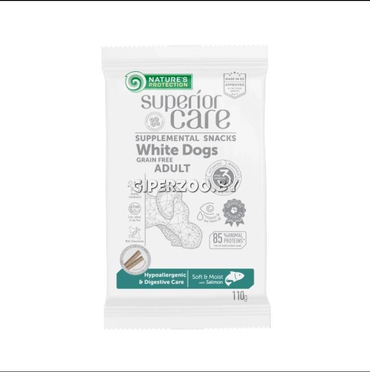 Nature's Protection Superior Care White Dogs Grain Free Hypoallergenic & Digestive Care (Лосось) – кормовая добавка высочайшего качества для взрослых собак всех пород с белой или светлой шерстью. Это идеальный выбор, чтобы проявить любовь к вашей собаке и в то же время обеспечить ее ежедневной дозой необходимых витаминов, минералов, пребиотиков.