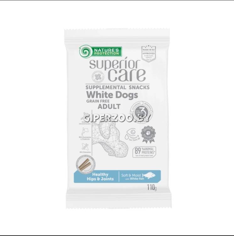 Беззерновые лакомства Natures Protection SC White Dogs Healthy hips&joints (рыба), 110 гр (рыба), 110 гр – представляют собой кормовую добавку высочайшего качества, предназначенную для взрослых собак всех пород с белой или светлой шерстью. Это идеальный выбор, чтобы проявить любовь к вашей собаке и в то же время обеспечить ее ежедневной дозой необходимых витаминов, минералов, пребиотиков и пробиотиков. Эти функциональные лакомства для собак содержат формулу Tear Stains Off — тщательно подобранный комплекс аминокислот и полностью сбалансированные ингредиенты в составе, которые помогают бороться с коричневыми слезными пятнами вокруг глаз, рта, лап или других частей тела питомца. Источник белка – 1-й ингредиент в составе.