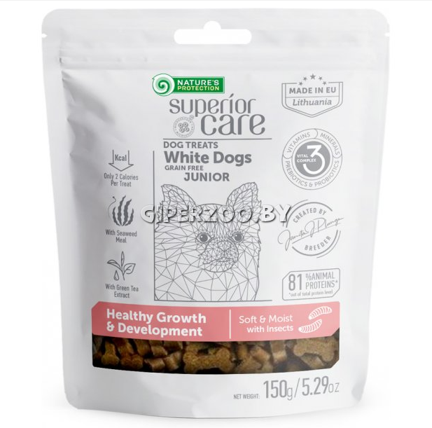 Nature's Protection Superior Care White Dogs — это премиальная пищевая добавка из насекомых, специально разработанная для поддержки здорового роста и развития всех пород молодых собак с белой шерстью.