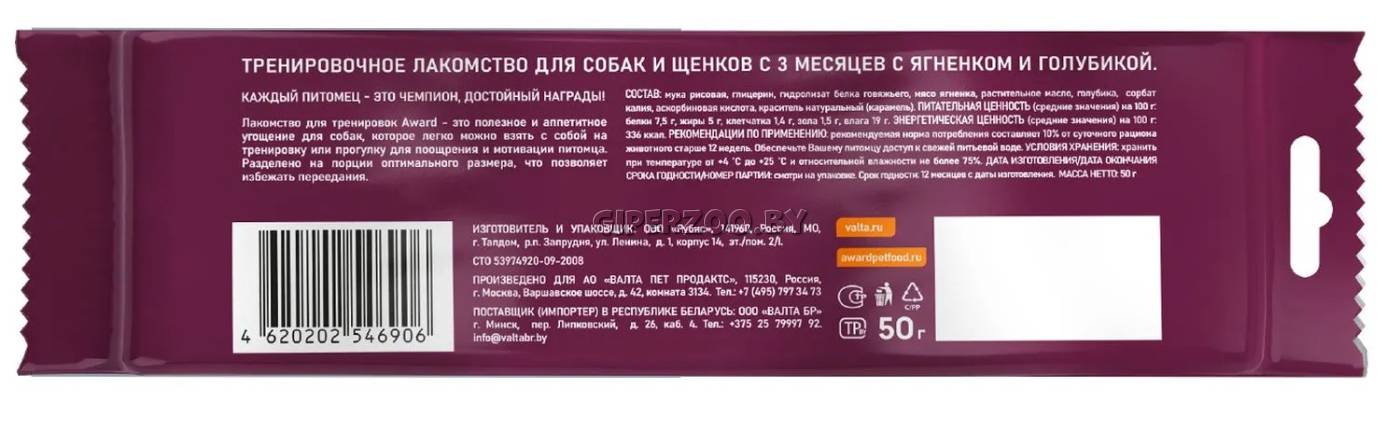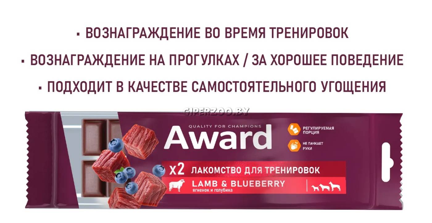 AWARD Лакомство для тренировок (ягненок и голубика) — это полезное и аппетитное угощение для собак, которое легко можно взять с собой на тренировку или прогулку для поощрения и мотивации питомца. Разделено на порции оптимального размера, что позволяет избежать переедания.