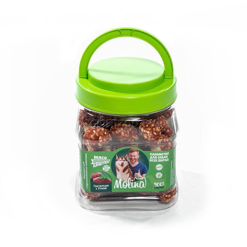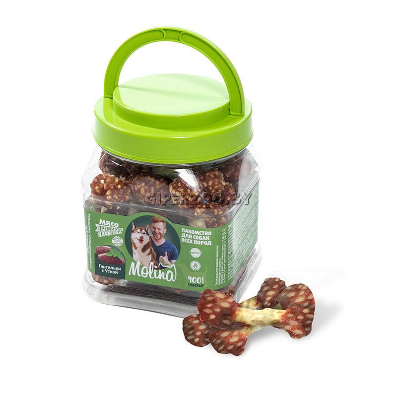 Molina Лакомство для собак (гантельки с уткой) - вяленое мясо утки и полезная косточка в виде гантелек непременно понравятся вашему питомцу. Лакомство содержит КАЛЬЦИЙ - необходимый для профилактики кариеса и укрепления зубной эмали и костей собаки. Натуральный и вкусный продукт, без искусственных добавок, красителей, ГМО и усилителей вкуса, идеален для поощрения, игры, перекуса и дрессур.