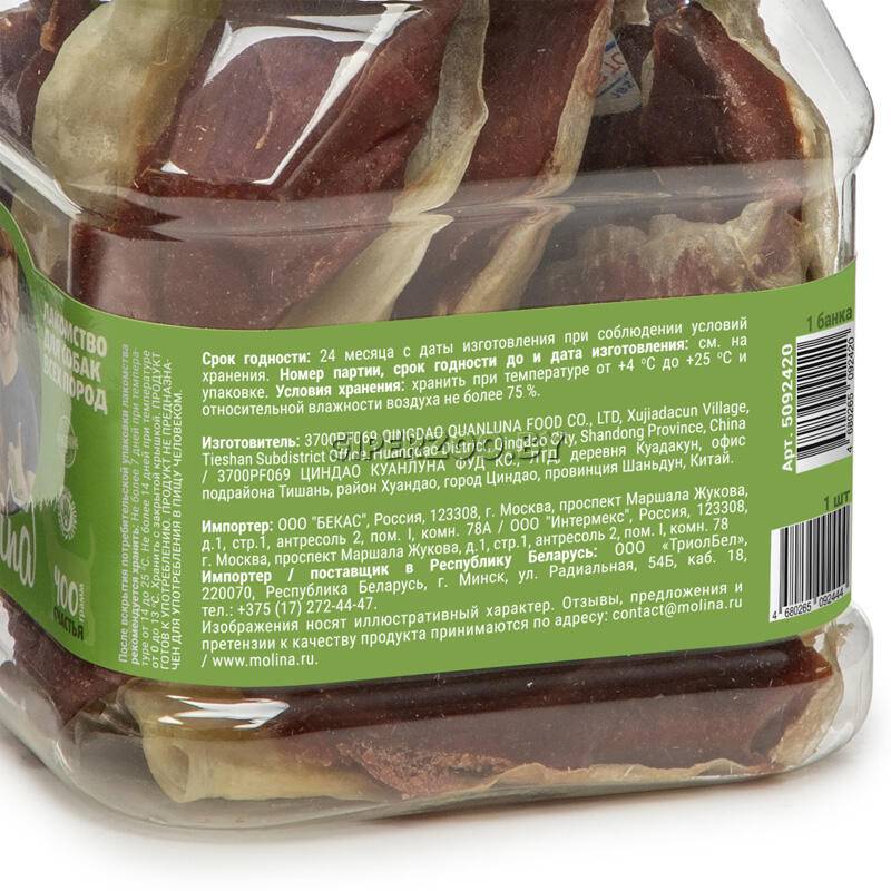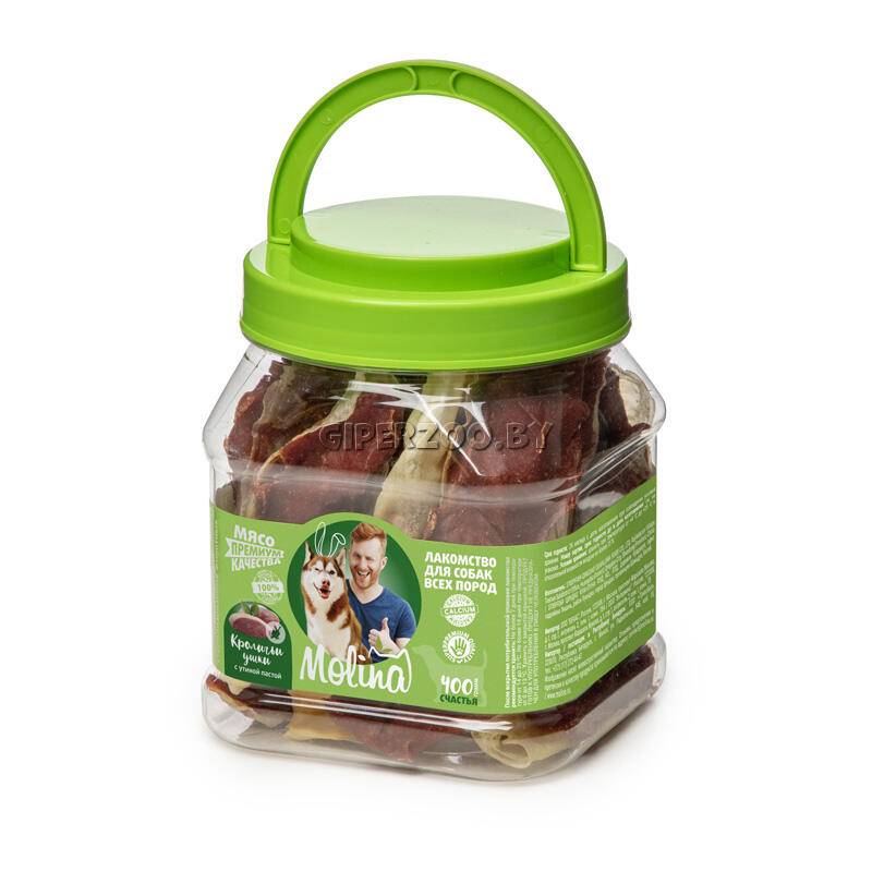 Molina Лакомство для собак и щенков (с утиной пастой) - аппетитное лакомство для собак в виде кроличьего уха с мясом утки. Уши обогащены кальцием, который необходим собакам для формирования крепких костей и зубов. Лакомства будут особенно полезны щенкам и молодым растущим собакам в период формирования костной системы. Низкое содержание жира и высокое содержание белка позволит соблюдать диету и поддерживать оптимальный вес животного. Идеально для поощрения, игры и перекуса. Можно использовать как лакомство для дрессировки. Без искусственных красителей, консервантов, ароматизаторов.