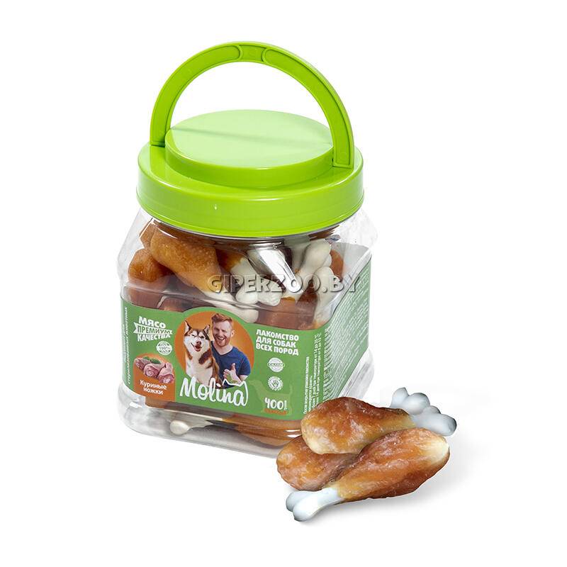 Molina Лакомство для собак (куриные ножки) - вяленое мясо курицы на кальциевой косточке. Натуральный и вкусный продукт, без искусственных добавок, красителей, ГМО и усилителей вкуса, идеален для поощрения, игры, перекуса и дрессур.