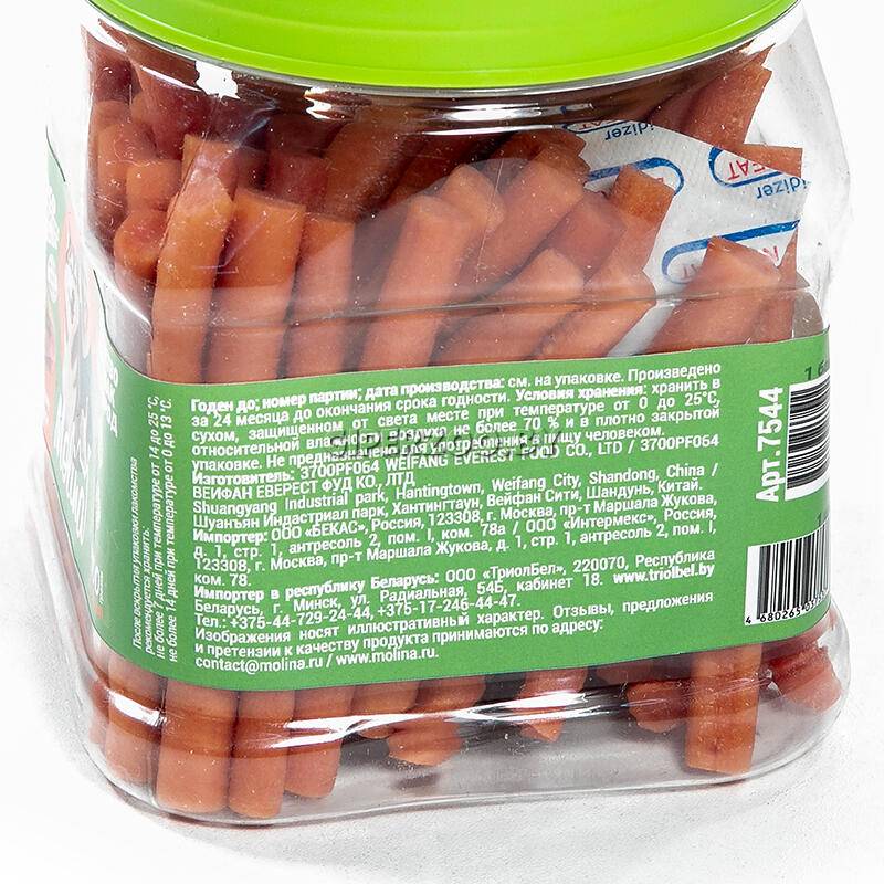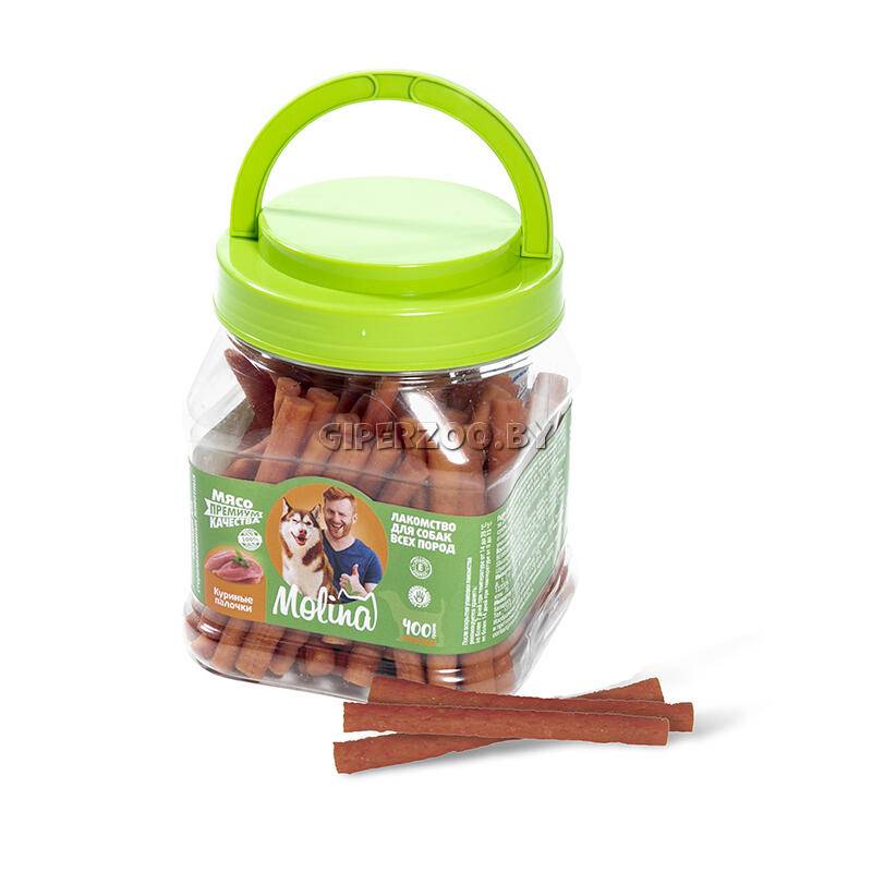Molina Лакомство для собак (куриные палочки) - палочки из мяса курицы непременно понравятся вашему питомцу. Лакомство содержит ВИТАМИН Е, защищающий клетки от свободных радикалов и укрепляющий иммунную систему собаки. Натуральный и вкусный продукт, без искусственных добавок, красителей, ГМО и усилителей вкуса, идеален для поощрения, игры, перекуса и дрессур.