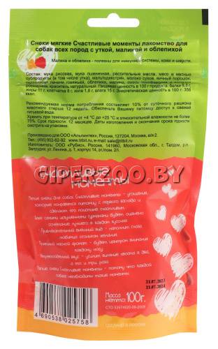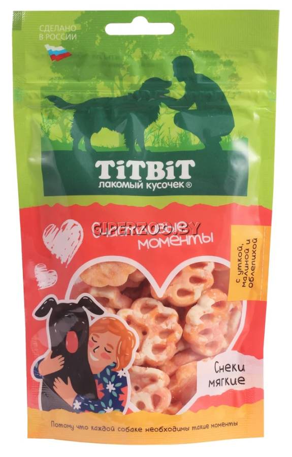 ТИТБИТ Счастливые моменты Снеки мягкие (утка, малина, облепиха), 100 гр – это идеальное угощение для вашего питомца, которое подарит ему радость с первого кусочка. Сочетание нежной утки, малины и облепихи создаёт неповторимый вкус, который оценят даже самые привередливые гурманы.