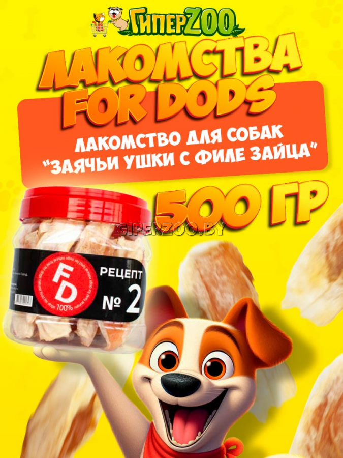 For Dogs Рецепт №2 - Заячьи ушки с филе зайца - это натуральное лакомство для собак всех пород. Рецептуры For Dogs – это разнообразие вкусов, 100% натуральные ингредиенты, удобный размер и форма.