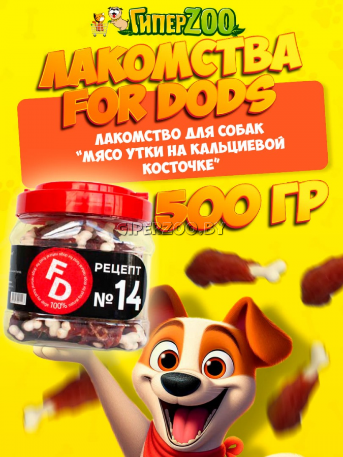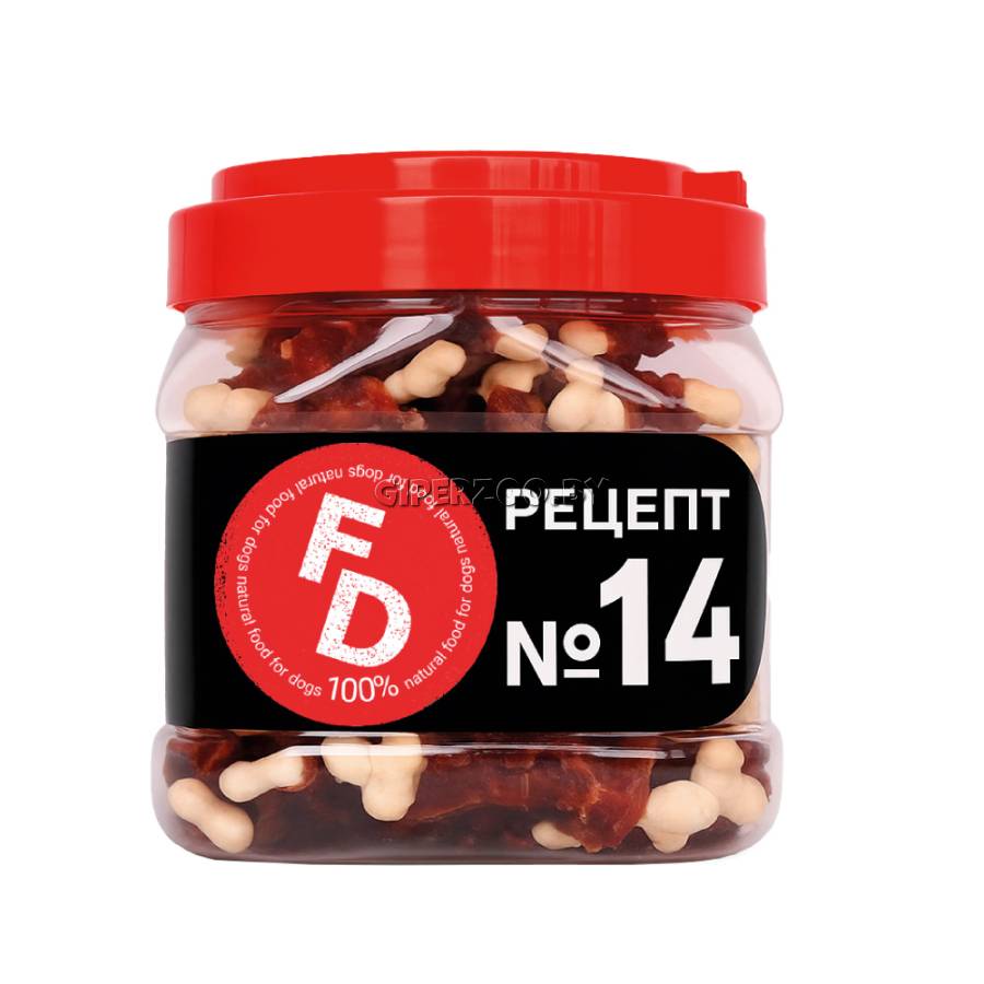 For Dogs Рецепт №14 - Мясо утки на кальциевой косточке - это натуральное лакомство для собак всех пород. Рецептуры For Dogs – это разнообразие вкусов, 100% натуральные ингредиенты, удобный размер и форма.