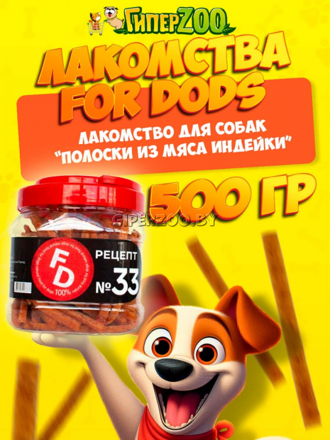 For Dogs Рецепт №33 - Полоски из мяса индейки - это натуральное лакомство для собак всех пород. Рецептуры For Dogs – это разнообразие вкусов, 100% натуральные ингредиенты, удобный размер и форма. Продукт подходит для собак старше 3-х месяцев. Оказывает благотворное влияние на состояние зубов и костей питомцев, насыщает организм полезными витаминами и минералами. Не содержит добавок и красителей.