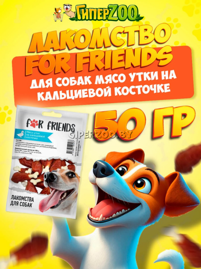 Лакомство для собак For Friends Мясо утки на кальциевой косточке,50 гр - это натуральное лакомство, которое подойдет для любой породы собак старше 3-х месяцев.