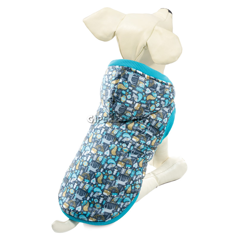 Утепленная попона "Зимняя сказка" с капюшоном для комфортных прогулок даже в самую ненастную погоду. Попона украшена оригинальным принтом на спине. Застегивается при помощи трех заклепок на животе. Подкладка: флис. Длина спины: 250мм; обхват груди: 380мм; обхват шеи: 290мм. Цвет: серо-зеленый.