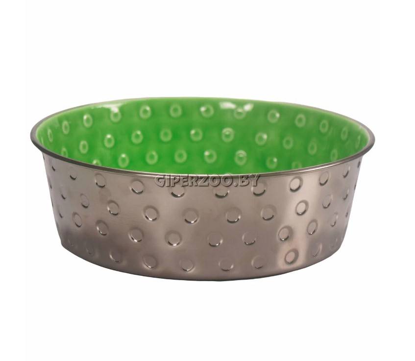 Mr.Kranch Миска из нержавеющей стали с керамическим покрытием Candy, зеленая — яркая и стильная миска для кормления питомцев из нержавеющей стали. Удобная эргономичная форма миски наилучшим образом подходит для всех видов корма и воды. Миска устойчива и не переворачивается за счет силиконовой накладки на дне. Прочный и безопасный материал – нержавеющая сталь – надолго сохранят свежесть воды и корма. Яркое керамическое покрытие дополнительно защищает и предотвращает поверхность миски от появления царапин.