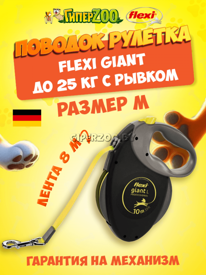 Рулетка Flexi Giant черная M, лента 8 м — это особо прочный и надёжный поводок-рулетка, предназначенный для выгула активных и сильных собак весом до 25 кг. Отличительной чертой этой модели является большая длина ленты (8 метров), предоставляющая питомцу максимальную свободу движения. Рулетка производится в Германии, что гарантирует высокое качество и долговечность.