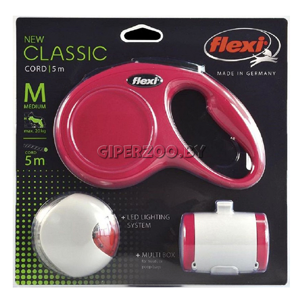 Комплект Рулетка Flexi New Classic M трос 5м, для собак до 20 кг красная + Фонарик LED + Multi Box