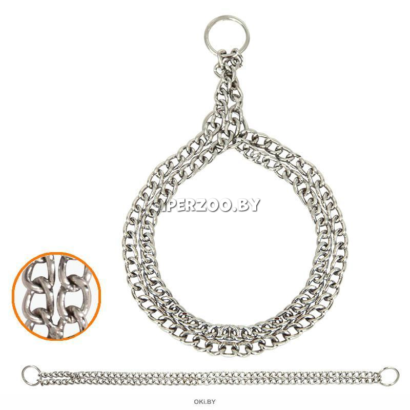 Двухрядный металлический ошейник-удавка, затягивающийся при натяжении поводка. Служит для дрессировки с целью усиления воздействия при рывках. Не перетирает шерсть. Выбирать длину цепочки нужно так, чтобы у собаки при надевании ошейника проходила голова, но не слишком свободно, чтобы он самопроизвольно не слетал и собака его не потеряла при наклоне головы или в прыжке. Диаметр проволоки - 2мм, длина - 400мм.