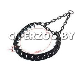 Ошейник из металлических пластин шириной 27мм с загнутыми со стороны шеи собаки шипами высотой 1см. Детали ошейника обработаны воронением. Рассчитан на собак с обхватом шеи 60см.