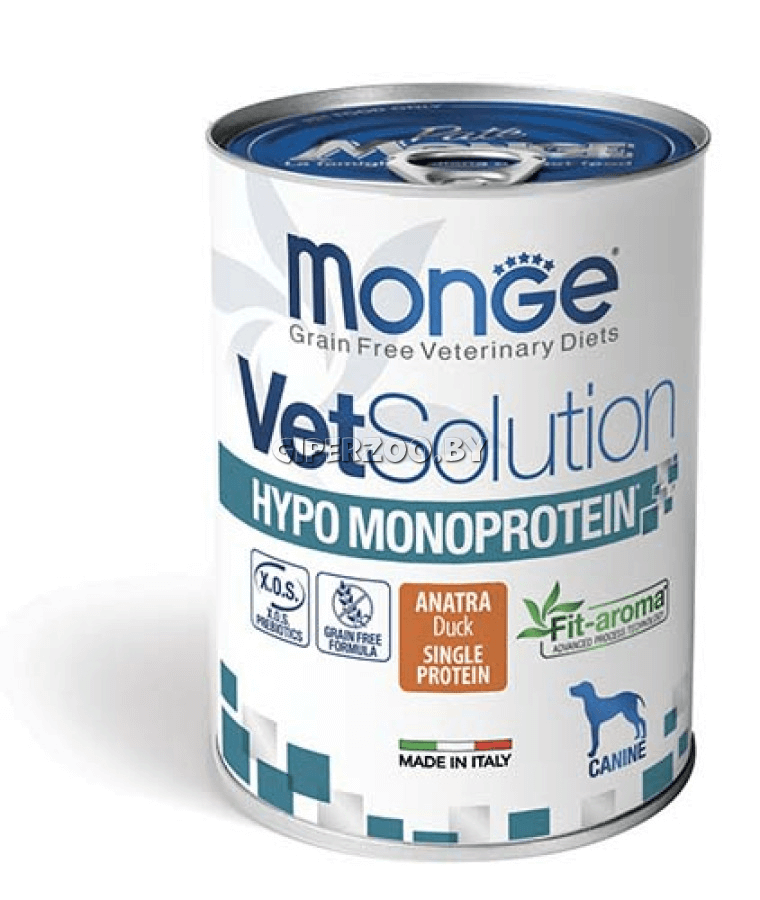 Monge VetSolution Hypo Monoprotein Dog (Утка), 400 гр — это полноценный диетический корм для собак, разработанный для снижения непереносимости ингредиентов и питательных веществ.