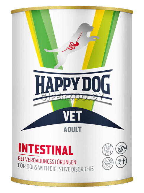 Happy Dog VET Diet Intestinal используется в качестве полноценного диетического питания для уменьшения нарушений всасывания в кишечнике у молодых собак от 6 месяцев и взрослых собак.
