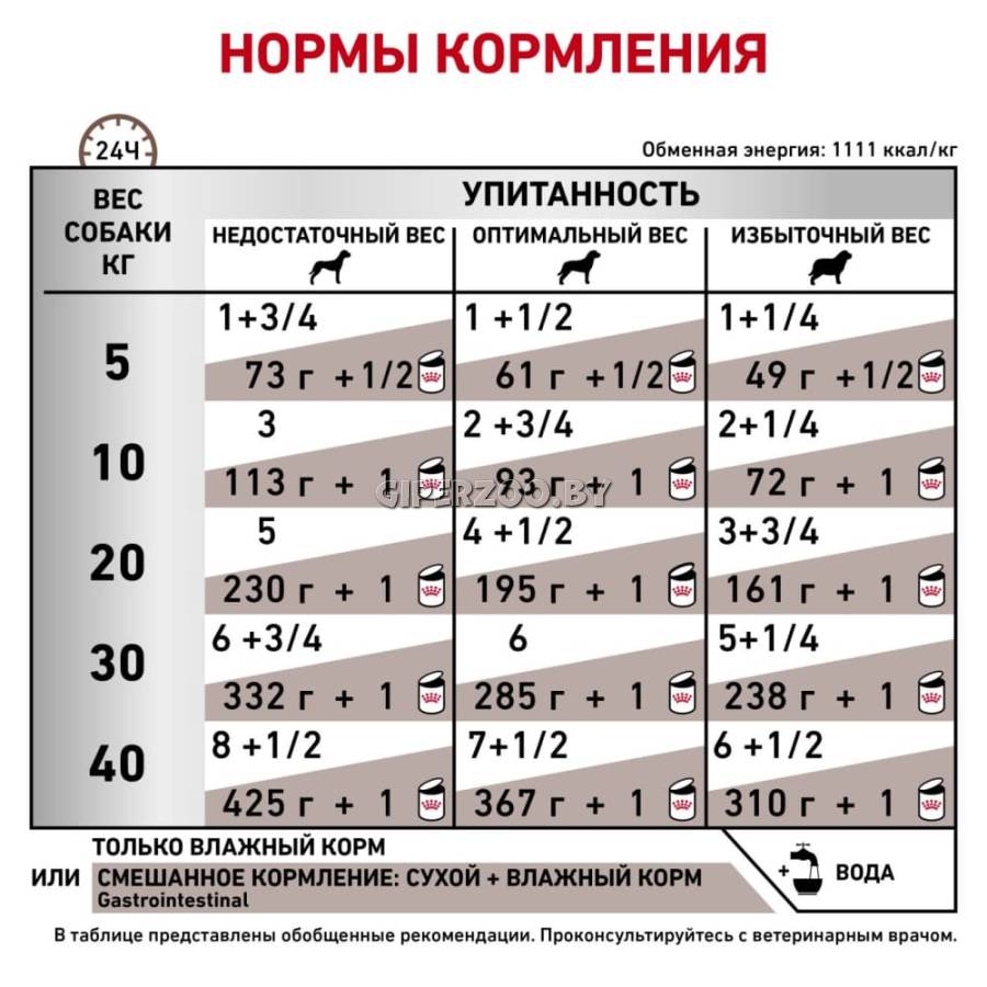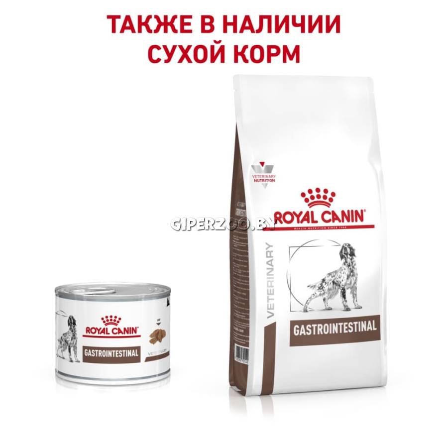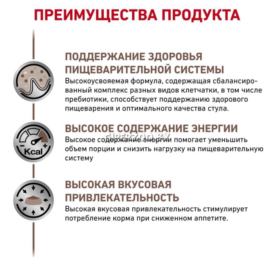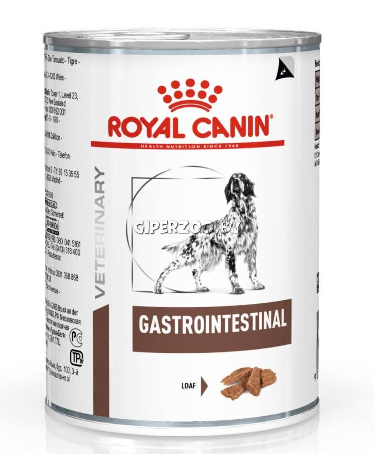 Royal Canin Gastro Intestinal - диета для собак с нарушениями пищеварения. Показания: - Острая и хроническая диарея; - Хроническое воспаление кишечника; - Плохая переваримость и абсорбция питательных веществ; - Восстановительный период после болезни; - Пролиферация бактерий в тонком кишечнике; - Экзокринная недостаточность поджелудочной железы; - Колит; - Гастрит; - Анорексия. Противопоказания: - Панкреатит (в т.ч. перенесенный ранее); - Гиперлипидемия; - Лимфангиэктазия; - Печеночная энцефалопатия; - Заболевания, при которых рекомендована низкокалорийная диета. Благодаря высокому содержанию энергии удовлетворяются потребности собак, в то же время уменьшается объем корма и снижается нагрузка на желудочно-кишечный тракт. При регулярном кормлении Royal Canin Gastro Intestinal восстанавливается вес в период выздоровления. Состав: Свинина и мясо птицы, лосось, рис, растительная клетчатка, подсолнечное масло, минеральные вещества, желирующие вещества, таурин, рыбий жир, экстракт дрожжей.