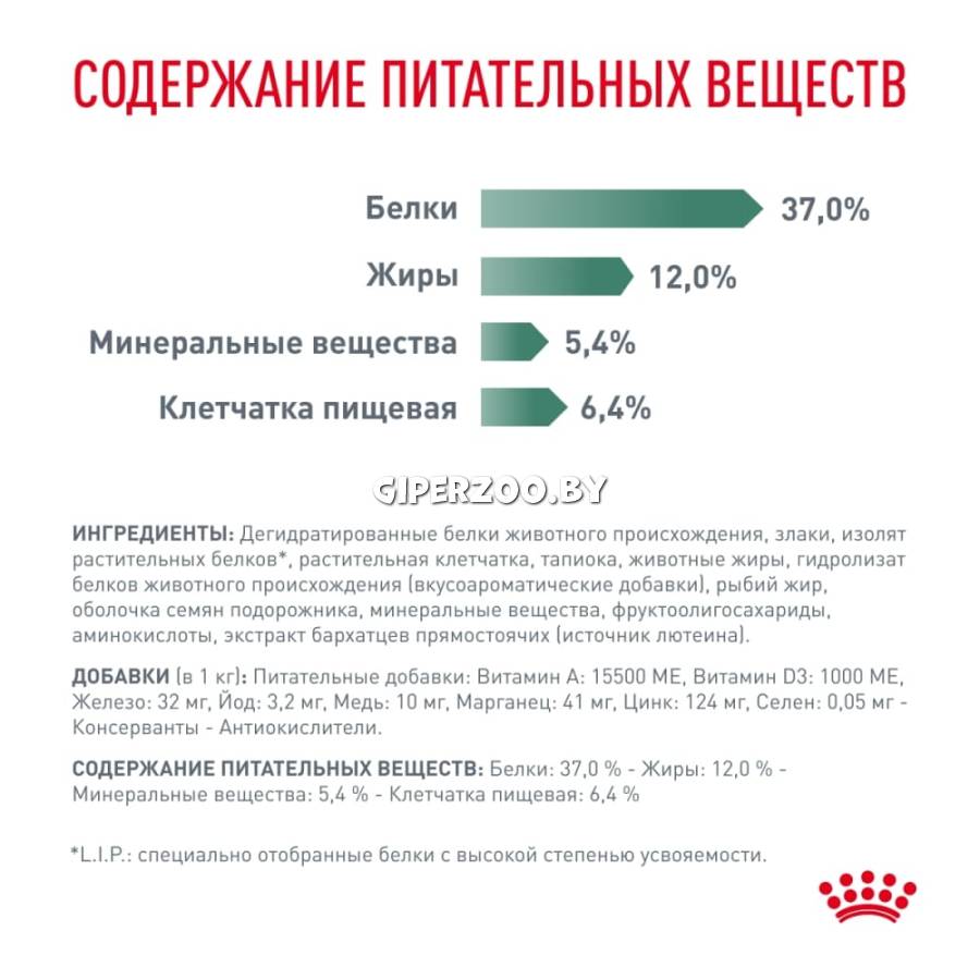злаки, изолят растительных белков*, дегидратированные белки животного происхождения (птица), дегидратированные белки животного происхождения (свинина), растительная клетчатка, животные жиры, тапиока, гидролизат белков животного происхождения (вкусоароматические добавки), рыбий жир, минеральные вещества, оболочка и семена подорожника, фруктоолигосахариды, экстракт бархатцев прямостоячих (источник лютеина).