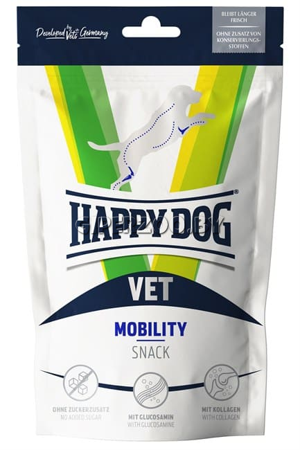 - Happy Dog VET Snack Mobility содержит глюкозамин и коллаген в сбалансированных количествах и, таким образом, может обеспечить лучшее качество жизни, мотивацию и удовольствие от упражнений.