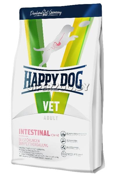 Happy Dog VET Diet Intestinal Low Fat Adult, 1 кг - это диетический полнорационный корм для собак, при нарушении жирового обмена, при панкреатите, при гиперлипидемии.