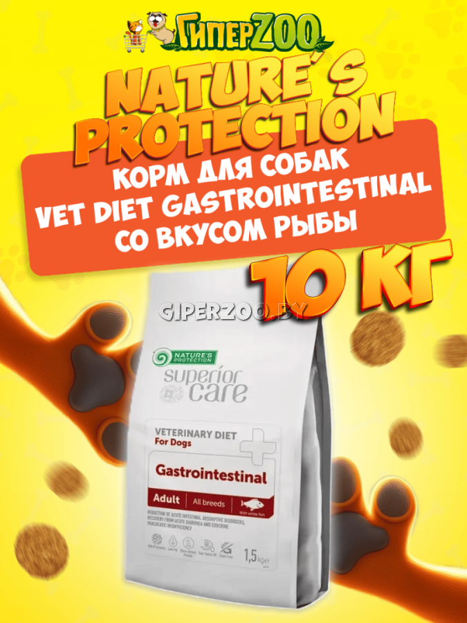Nature's Protection Vet Diet Gastrointestinal (рыба), 10 кг для желудочно-кишечного тракта были исключительно сбалансированы, чтобы помочь контролировать проблемы с кишечником или пищеварением.