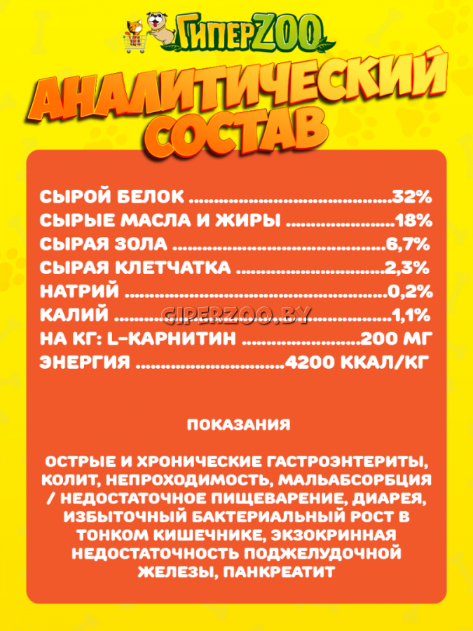 Сублимированная курица, маниока (тапиока), картофель, куриный жир (законсервированный смесью токоферолов и экстрактом розмарина), яичный порошок, гидролизованный белок лосося, дегидрированный горох, масло лосося, сублимированная рыба (анчоус), порошок из семян рожкового дерева, нерастворимые волокна гороха, сублимированная утка, пивные дрожжи, свекольная пульпа, витамины, ксилоолигосахариды (0,4%), минеральные соли, микроэлементы (включая хелатные формы), экстракт конского каштана (0,01%), L-карнитин, таурин Lactobacillus acidophilus, Lactobacillus casei, Lactobacillus plantarum, Streptococcus thermophiles, сублимированная мякоть дыни (0,005% — источник супероксиддисмутазы).