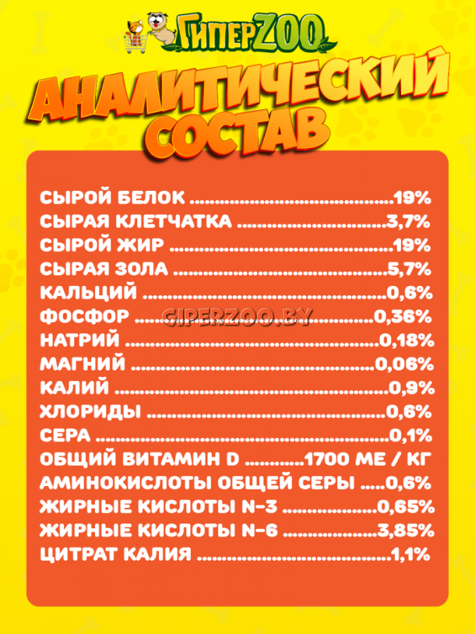 вяленое куриное мясо (23%) **, тапиока, животный жир (утиный жир) *, картофель, сушеная морковь, животный жир (куриное масло) *, сушеный свекольный жом, сушеный ананас, сушеная мякоть цитрусовых, сушеная рыба (анчоусы) * *, рыбий жир (масло лосося) *, сушеное мясо утки **, минералы, томатная масса, пивные дрожжи, гороховая клетчатка, ксило-олигосахариды (XOS 0,4%), сушеные листья зеленого чая (0,15%), продукты и побочные продукты. продукты переработки свежих фруктов и овощей (концентрат дынного сока - Cucumis melo cantalupensis - источник супероксидисмутазы 0,005%), сухой молочный протеин **. * очищено на 99,6%, консервировано натуральными антиоксидантами. ** Источники белка (усвояемость> 85%).