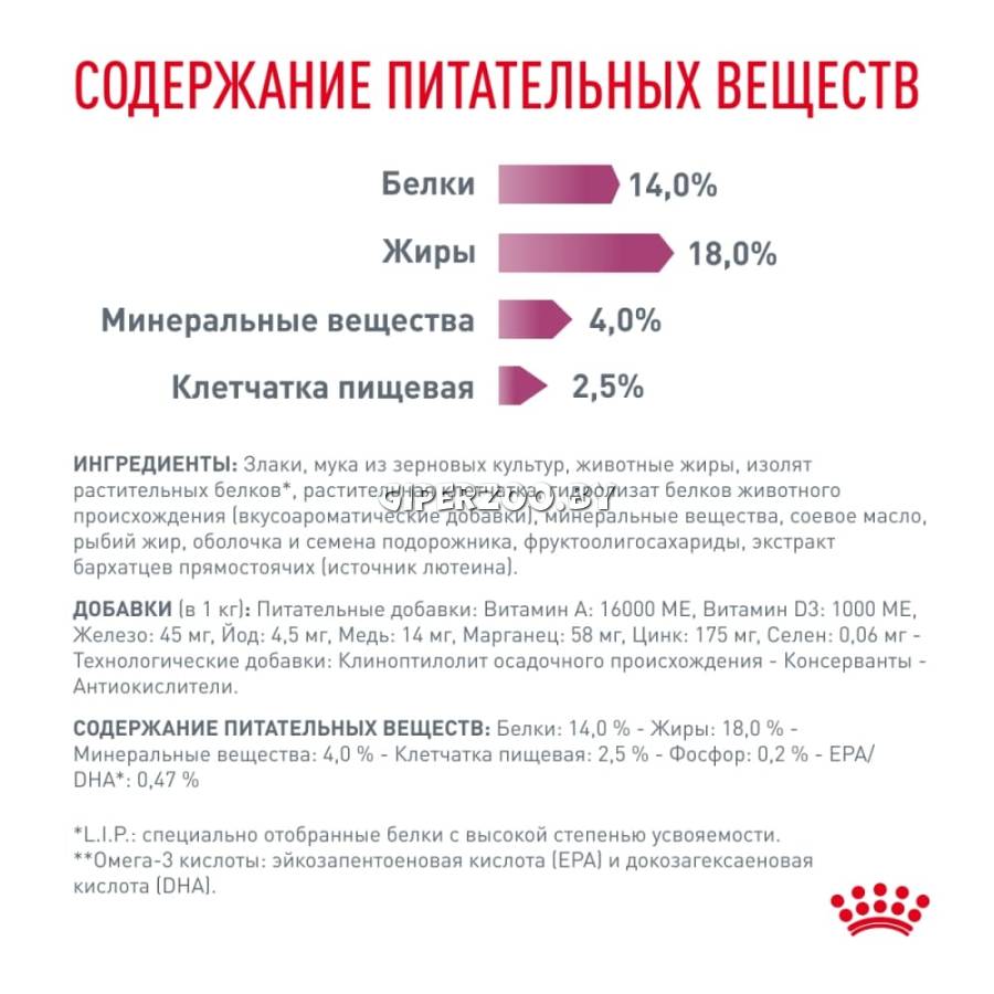 рис, кукурузная мука, животные жиры, кукуруза, дегидратированные белки животного происхождения (птица), гидролизат белков животного происхождения (вкусоароматические добавки), свекольный жом, пшеничная клейковина*, рыбий жир, минеральные вещества, растительная клетчатка, соевое масло, оболочка и семена подорожника, фруктоолигосахариды, моно- и диглицериды пальмитиновой и стеариновой кислот, этерифицированные лимонной кислотой, экстракт бархатцев прямостоячих (источник лютеина). Источники белков: дегидратированные белки животного происхождения (птица), гидролизат белков животного происхождения (вкусоароматические добавки), пшеничная клейковина*.
