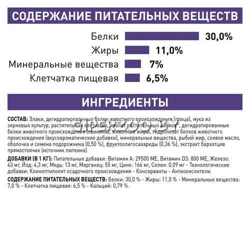 ячмень, кукуруза, дегидратированные белки животного происхождения (свинина), дегидратированные белки животного происхождения (птица), пшеничная мука, растительная клетчатка, пшеничная клейковина*, гидролизат белков животного происхождения (вкусоароматические добавки), животные жиры, минеральные вещества, экстракт цикория, соевое масло, рыбий жир, оболочка и семена подорожника, фруктоолигосахариды, экстракт бархатцев прямостоячих (источник лютеина).