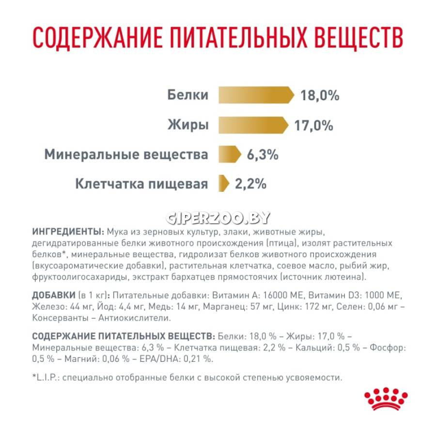 рис, кукурузная мука, животные жиры, дегидратированное мясо птицы, кукурузная клейковина, минеральные вещества, гидролизат животных белков, растительная клетчатка, яичный порошок, соевое масло, рыбий жир, фруктоолигосахариды (ФОС), DL-метионин, L-лизин, таурин, экстракт бархатцев прямостоячих (источник лютеина), L-триптофан.