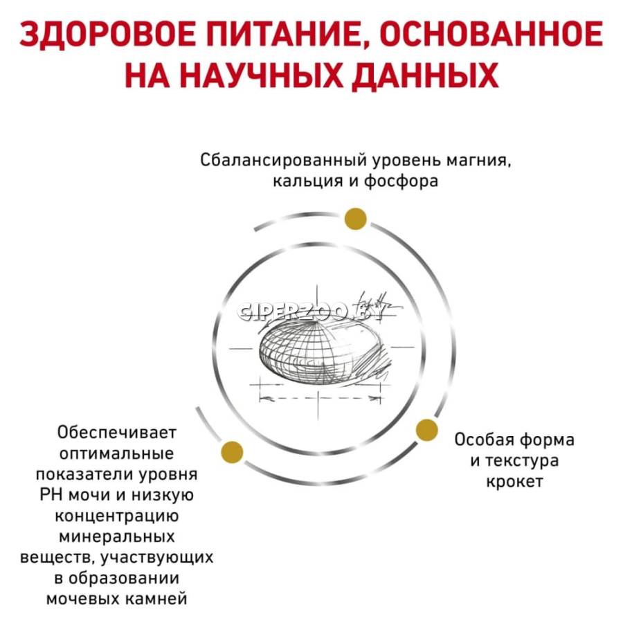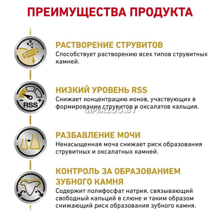 Корм растворяет струвитные кристаллы и создаёт неблагоприятную среду для размножения бактерий. Происходит разбавление мочи, что снижает концентрацию оксалатов кальция. Большое количество мочи промывает мочевой пузырь. Помимо всего прочего, снижается риск образования зубного камня за счет добавления полифосфата натрия.