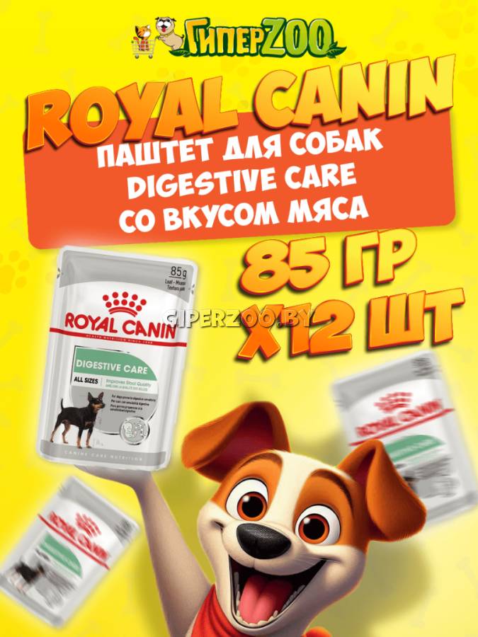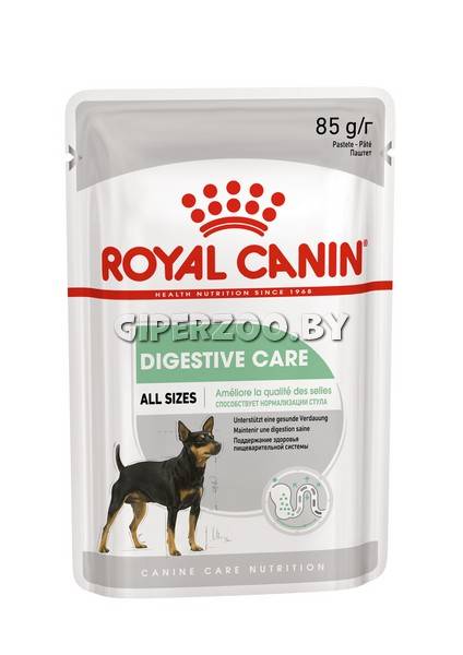 Royal Canin DIGESTIVE CARE (паштет), 85 гр*12 шт - подходит для собак любых пород вне зависимости от их размеров. В состав влажного корма входят высокоусвояемые белки, а также комбинация пребиотиков и различных видов клетчатки. Таким образом, корм способствует поддержанию баланса кишечной микрофлоры и улучшает качество стула. Тщательному отбору белков, используемых в продукте, Royal Canin придает особое значение.