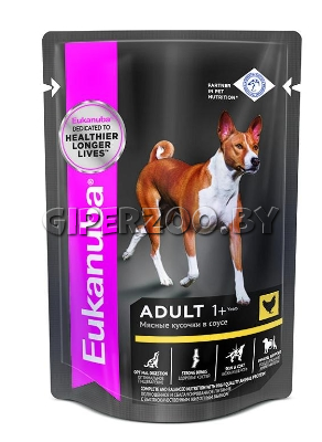 Eukanuba Adult All Breed (Курица в соусе), 100 гр - полноценное и сбалансированное питание для взрослых собак всех пород в возрасте старше 1 года с высококачественным животным белком.