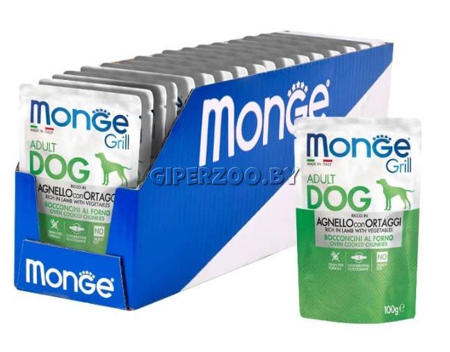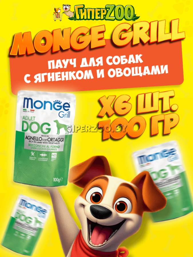 Monge Пауч Grill Adult Dog (Ягненок с овощами) — это полноценный и сбалансированный корм для собак с ягненком и овощами.